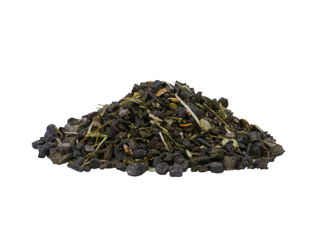 vojtěška, slunečnicové slupky, slunečnice, sušené jablečné výlisky, čekankové řízky, bojínek luční, vločky hrachu, lupina sladká, lněný olej, bramborový škrob, dihydrogenfosforečnan vápenatý, chlorid sodný, uhličitan vápenatý, slunečnicový olej, lněné expelery, oxid hořečnatý. Analytické složky v 1kg: hrubý protein 13,2 %; hrubé oleje a tuky 4,3 %; hrubá vláknina 27,6 %; hrubý popel 8,1 %; sodík 0,5 %; škrob 6,2 %; cukr 3,4 %. Nutriční doplňkové látky v 1kg: Vitaminy: vit.A 14 000 m.j.; vit. D3 3 500 m.j.; vit E 135 mg. Mikroprvky: železo 58 mg; jód 2,0 mg; měď 15 mg; mangan 46 mg; zinek 97 mg; selen 0,3 mg. Energie: 8,5 MJ/kg