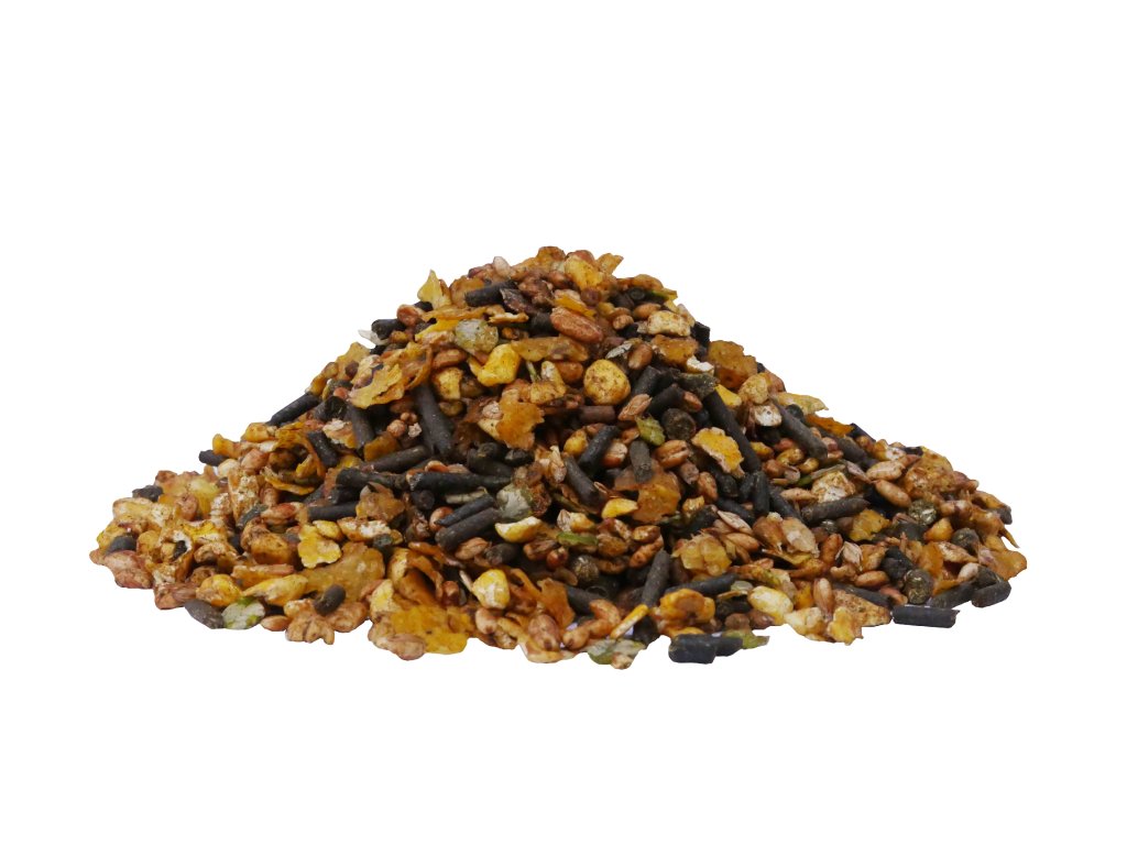 bojínek luční, vločky ječmene, slunečnice, vojtěška, vločky kukuřice, sója, pšeničné middlings, pufovaný ječmen, pufovaná kukuřice, vločky hrachu, slunečnicové slupky, slunečnicový olej, třtinová melasa, uhličitan vápenatý, krmná pšenice, chlorid sodný, lněné expelery, lněné semeno, dihydrogenfosforečnan vápenatý, ječmen, pivovarské kvasnice, oxid hořečnatý. Analytické složky v 1kg: hrubý protein 14,0 %; hrubé oleje a tuky 7,0 %; hrubá vláknina 12,0 %; hrubý popel 9,5 %; sodík 0,65 %; škrob 23 %; cukry 5 %. Nutriční doplňkové látky v 1kg: Vitaminy: vit.A 28 750 m.j.; vit. D3 1 750 m.j.; vit E 312,5 mg. Mikroprvky: železo 95 mg; jód 1,8 mg; měď 25 mg; mangan 74 mg; zinek 156 mg; selen 0,5 mg. Energie: 13,5 MJ/kg