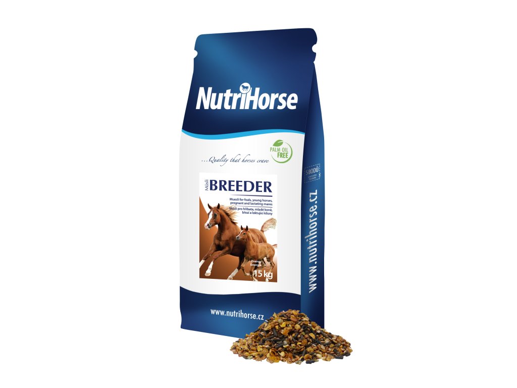 NutriHorse Müsli Breeder je kvalitní krmivo pro březí a laktující klisny, u kterých zajišťuje odpovídající růst plodu a následující laktaci. Dostatečná produkce mléka je základním předpokladem pro úspěšný odchov hříbat. Protože si hříbata navyknou na NutriHorse Müsli Breeder již pod matkou, není nic jednoduššího než pokračovat v krmení v odpovídající krmné dávce nadále. Zdravé a dobře vyvinuté hříbě je začátek kariéry kvalitního sportovního koně.