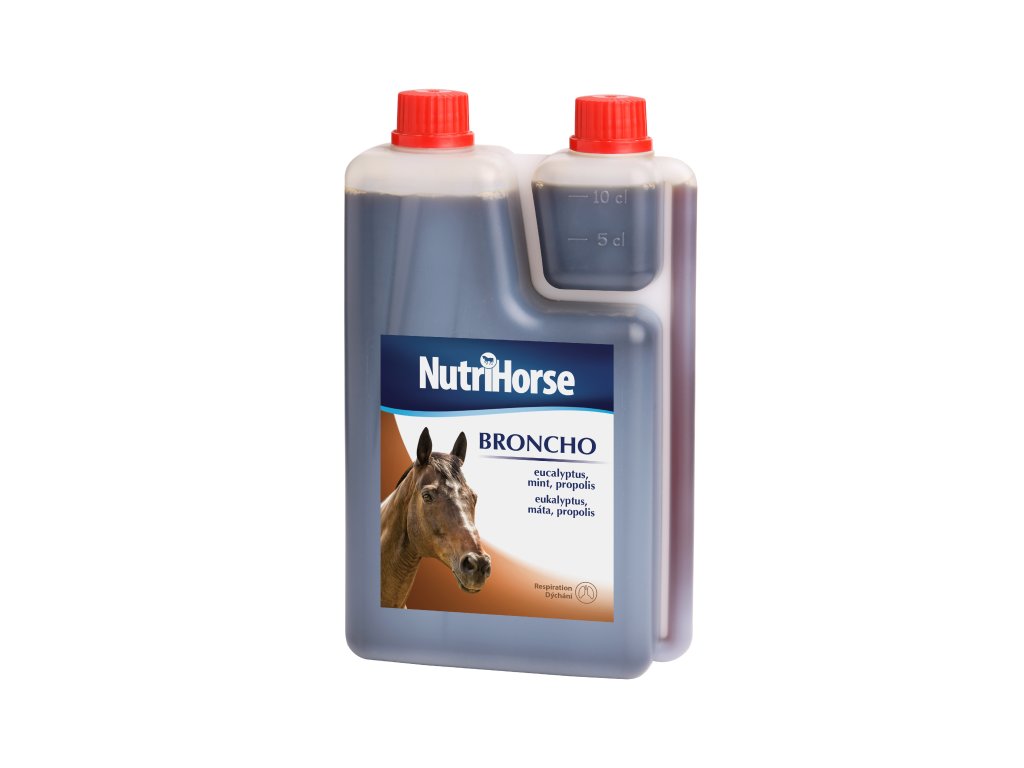 NutriHorse BRONCHO je tekutý přípravek, který obsahuje zdraví prospěšný eukalyptus a mátu. Tyto byliny byly využívány po staletí na léčbu kašle a při podráždění horních cest dýchacích. Zlepšuje kvalitu dýchání u koní. Přípravek je vhodné podávat na podporu léčby kašle a rýmy (ucpání horních cest dýchacích). Zlepšuje reakce imunitního systému díky obsahu propolisu.