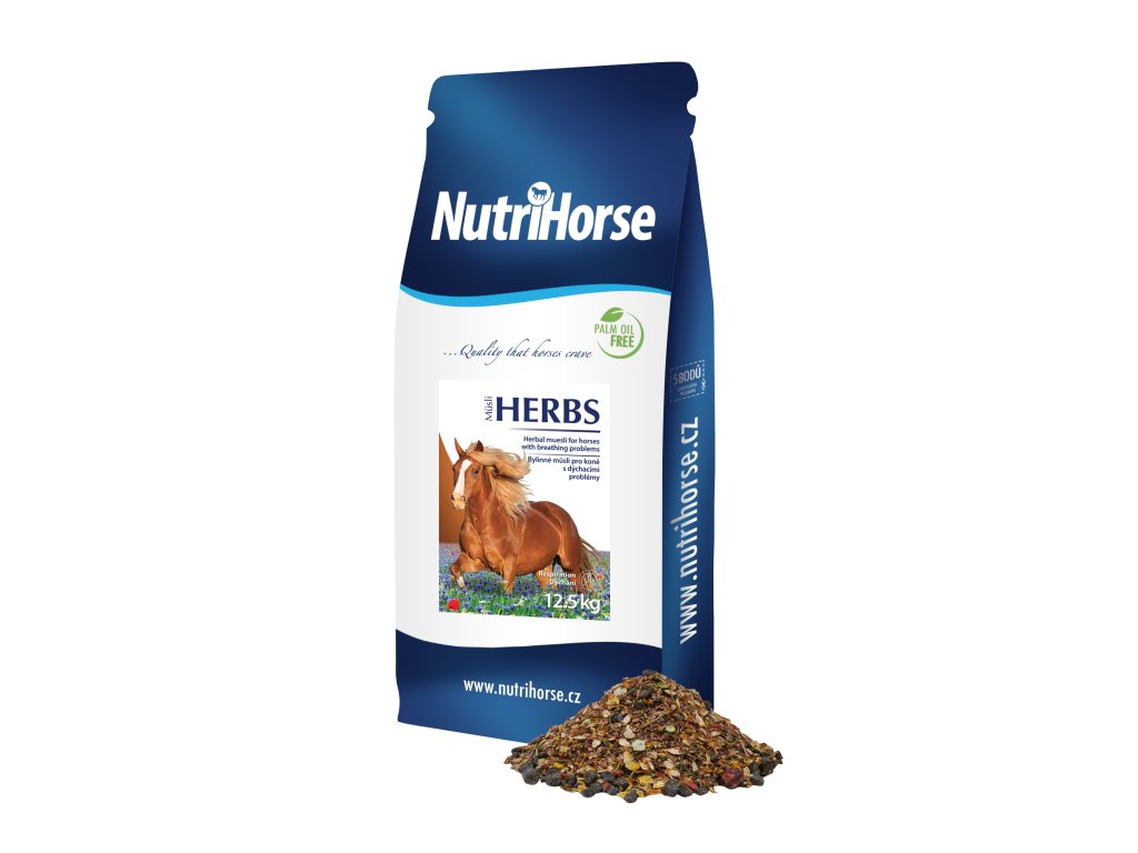 NutriHorse Müsli Herbs je výjimečné krmivo s obsahem vybraných bylin na podporu dýchání u koní. Posiluje přirozenou obranyschopnost organismu, pozitivně působí na průdušky a uvolňování hlenů. Pro lepší účinnost je vhodné müsli zalít horkou vodou, nechat zchladnout na cca 42 °C a nechat koně při žraní inhalovat páru.