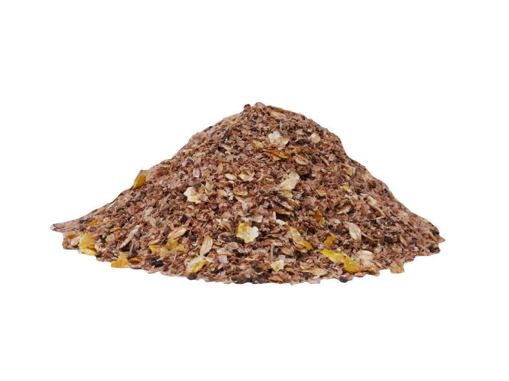 pšeničné otruby, vločkované lněné semeno, vločky ječmene, vločky kukuřice, sušené jablečné výlisky, čekankové řízky, třtinová melasa, uhličitan vápenatý, byliny. Analytické složky v 1kg: hrubý protein 12,5 %; hrubé oleje a tuky 10,0 %; hrubá vláknina 9,0 %; hrubý popel 6,0 %; sodík 0,15 %; škroby 26 %; cukry 5 %. Energie: 12,5 MJ/kg