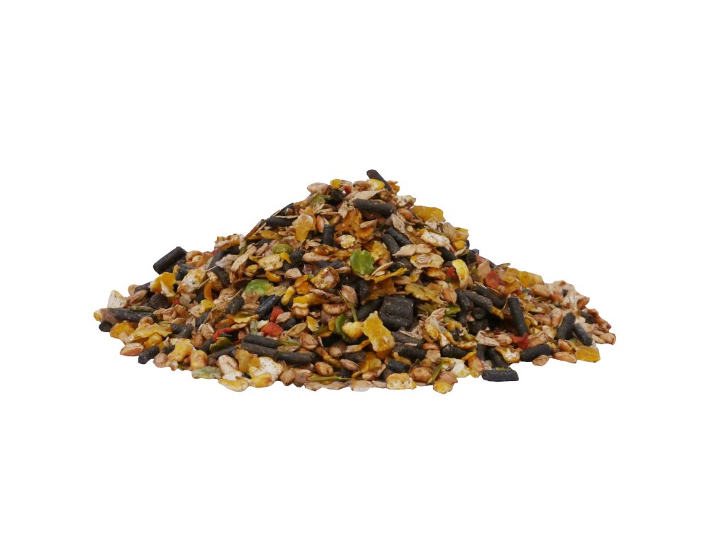 vločky ječmene, vločky kukuřice, slunečnice, pšeničné middlings, pufovaný ječmen, pufovaná kukuřice, slunečnicové slupky, vojtěška, slunečnicový olej, vločky hrachu, lněné expelery, sója, třtinová melasa, uhličitan vápenatý, chlorid sodný, krmná pšenice, vločky mrkve, dihydrogenfosforečnan vápenatý, lněné semeno, pivovarské kvasnice, oxid hořečnatý, ječmen, bramborový škrob. Analytické složky v 1kg: hrubý protein 13,2 %; hrubé oleje a tuky 7,0 %; hrubá vláknina 9,7 %; hrubý popel 8,1 %; sodík 0,6 %; škrob 32 %; cukry 4,4 %. Nutriční doplňkové látky v 1kg: Vitaminy: vit.A 27 600 m.j.; vit. D3 1 680 m.j.; vit E 300 mg. Mikroprvky: železo 91 mg; jód 1,8 mg; měď 24 mg; mangan 71 mg; zinek 150 mg; selen 0,4 mg. Energie: 14,5 MJ/kg